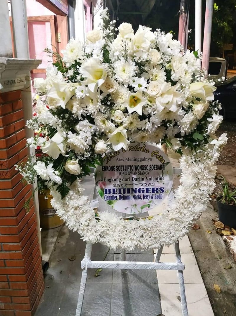 Kami menghadirkan desain standing flower duka cita yang sopan dan elegan dengan pilihan warna yang lembut dan tidak mencolok. Susunan bunga dibuat rapi dengan komposisi seimbang agar terlihat tenang dan penuh makna. Tulisan ucapan duka cita ditata jelas sehingga pesan dapat diterima dengan baik oleh keluarga almarhum.